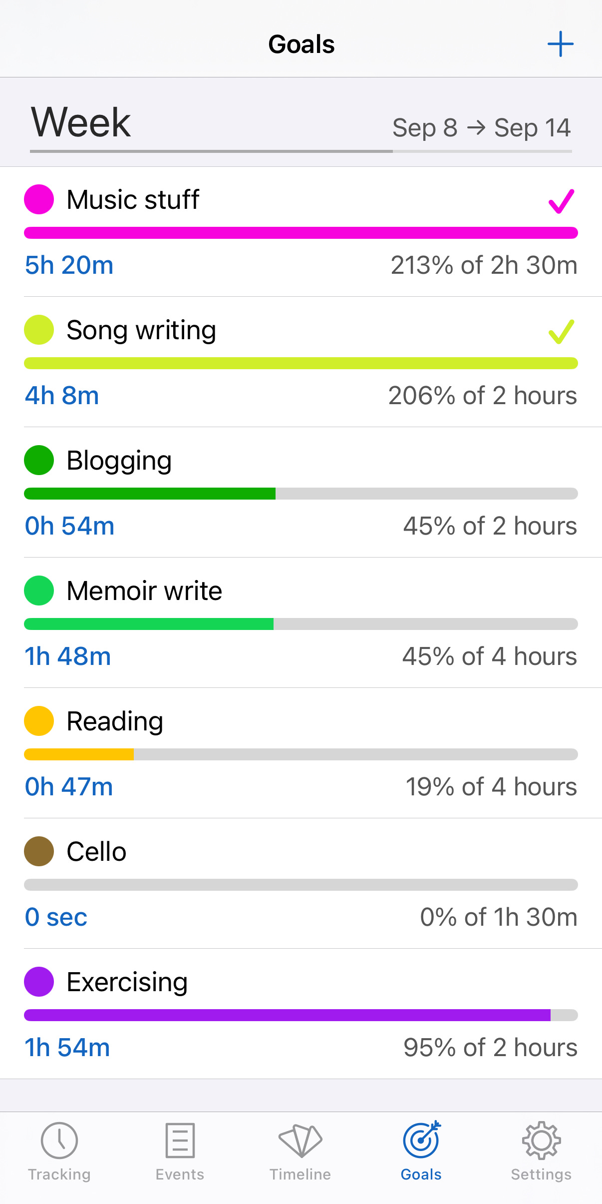 最近幾個月,其中一個用以衝擊並且監控自己的方法,是個叫“Timelines”的Visual tracker app。其實只是很簡單的一個計時器,在我每次開始坐下來工作時,就會因應那個工種打開相對的項目: “Memoir write”, “Songwriting”, “cello”, “reading”, “work/admin”等等。除了讓自己每週能邁向訂立的目標外,也是想有個方法去monitor住自己,看看我把每週的時間用在哪裡。